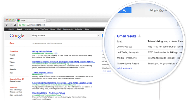 È ciò che a Mountain View stanno testando: se Google pensa che, nell’ambito di una ricerca, vi siano risultati a voi utili all’interno del vostro account GMail, ve li ritroverete nella SERP a destra.
