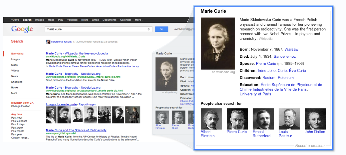Se cercate [Marie Curie] otterrete informazioni su vita/morte, ma anche su scoperte scientifiche e sulla sua educazione. La potenza del “graph” sta nella flessibilità: cercando, ad esempio, [Valentino Rossi] chiaramente il motore di ricerca capirà, in automatico, che vorrete molto probabilmente informazioni non sulle sue scoperte scientifiche, bensì sulle sue vittorie in pista. E si adatterà, volta per volta.