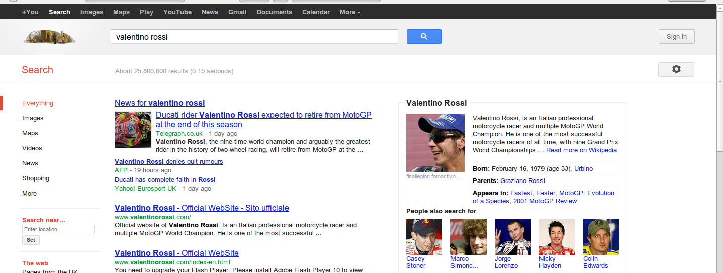 Abbiamo testato con una ricerca italiana, per [Valentino Rossi] abbiamo lo stesso tipo di risultato semantico: