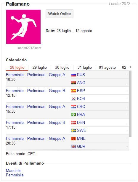 Digitando sia “Handball” che “Pallamano” compare un box relativo alle olimpiadi sulla destra della serp come il seguente: