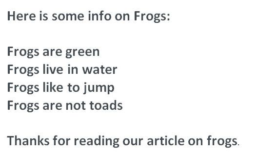 Questo risultato non è un duplicato del primo, ma le informazioni sono praticamente le stesse. Così tornerò indietro e sceglierò il terzo risultato: non è un duplicato, ma nemmeno qui troverò ciò che cerco. A questo punto sono molto frustrato, perché l’informazione che volevo è scoprire cosa mangiano le rane, ma non riesco a trovarla.