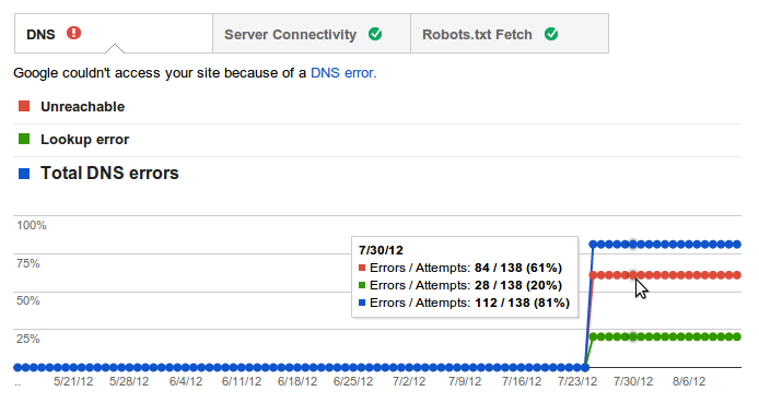 Disponibile alla voce “Site Errors”, questa nuova parte del Webmaster Tools si presenterà con un grafico che mostra gli errori degli ultimi 90 giorni e la percentuale di fallimento che riguarda il sito.